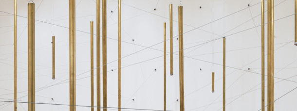 No poema anti-épico “A máquina do mundo”, de 1949, o renomado poeta brasileiro Carlos Drummond de Andrade revela o mecanismo do mundo enquanto o indivíduo permanece como um enigma. Assim como Drummond, a instalação Peso-contrapeso, da artista conceitual paulistana Marcia Pastore, bebe na fonte da teoria helênica e renascentista de que o mundo é uma máquina. Peso-contrapeso põe a nu um complexo e desconcertante mecanismo criado para executar um impressionante jogo de tensão ao traçar linhas com cabos de aço no vazio do espaço arquitetônico, que é um dos temas recorrentes de Pastore, assim como experimentações na engenharia civil.