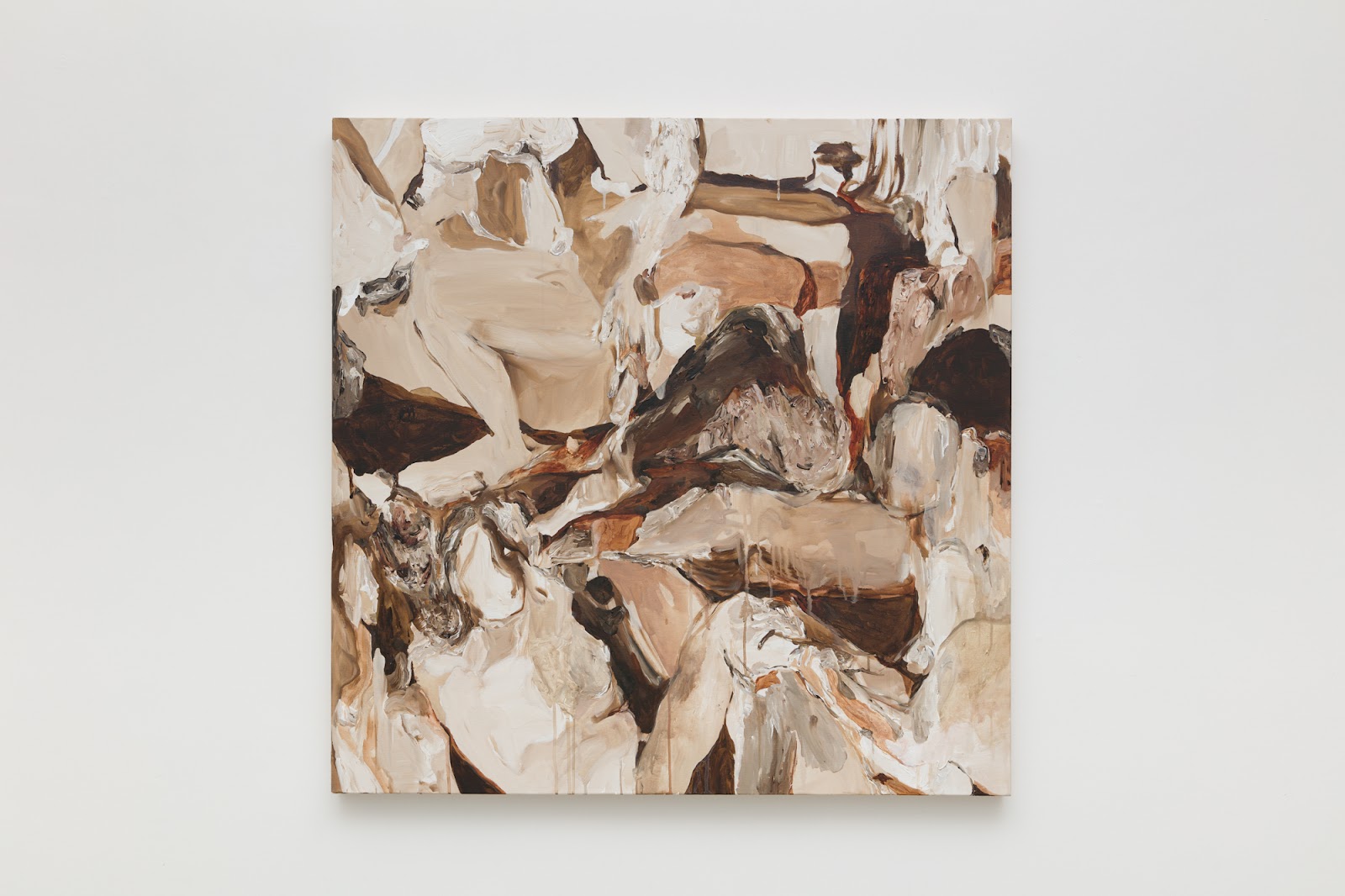 A pintura dialoga e tensiona com o desenho, em uma constante investigação sobre a gestualidade, o rastro, o erro, o inacabado e o imperfeito, representando um corpo que pende entre a figura e a abstração como exercício de percepção das subjetividades.