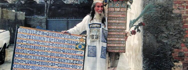 Cheguei a ver Gentileza, pela avenida Brasil, carregando o estandarte, os cabelos longos e grisalhos, a barba de um branco amarelado, o longo hábito branco com apliques de estrela, flor, santos, textos. A escrita nos pilares da Perimetral será ainda significante para os passantes do presente? Causou impacto essa escrita, ao sair, nos anos de 1980, dos estandartes e placas que produzia para ser incorporada à cidade, novas tábuas da lei para as relações humanas. As letras em verde sobre fundo branco, a simetria bem cuidada, a separação entre as linhas por filetes de cor amarela ou verde, os separadores de palavras guiando a leitura, como nos textos medievais. Uma etimologia particular, fil.hos, a repetição enfática de algumas letras: Amorrr, jessuss, univvverrsso, e o apelo profético a uma ordem de regeneração, de reflexão e crítica sobre o mundo contemporâneo. Nessa ordem, gentileza é a palavra inaugural, oposição ao consumismo capitalista.